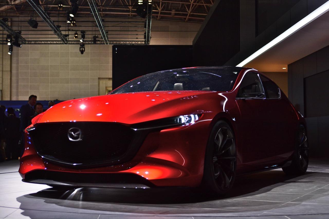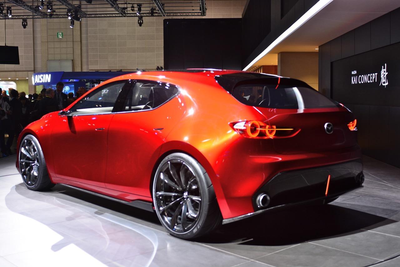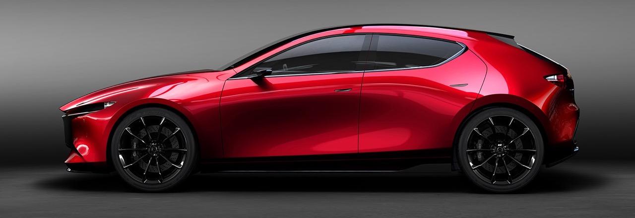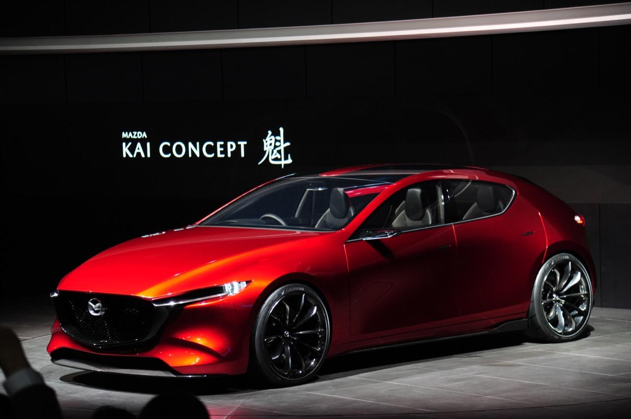 Mazda KAI Concept รถต้นแบบแนวคิดที่ถูก Mazda Motor นำมาจัดแสดงในงานโตเกียวมอเตอร์โชว์ครั้งที่ 45 ประจำปี 2017 จะกลายมาเป็น New Mazda 3 ซึ่งจะถูกเผยโฉมหน้าที่แท้จริงในช่วงปลายเดือนพฤศจิกายนนี้ KAI Concept คือตัวอย่างอันเด่นชัดของงานดีไซน์ใน New 3 โดยมีการปรับเปลี่ยนลงลึกในรายละเอียดของตัวรถคันผลิตจริงไม่มาก หลังคากระจก Panoramic Roof แบบผ่าครึ่งของรถต้นแบบถูกยกเลิกออกไป กลายเป็นซันรูฟแบบปกติ มือจับประตูทำงานด้วยระบบสัมผัสในรถคันต้นแบบจะกลายเป็นมือจับแบบธรรมดา แต่มีระบบ Keyless แค่แตะที่มือจับประตูก็จะปลดล็อก กระจกมองข้างแบบกล้องมองภาพจะเปลี่ยนเป็นกระจกมองข้างแบบธรรมดาพร้อมเลนส์ไฟเลี้ยว ล้ออัลลอยขอบใหญ่ยักษ์ขนาด 20 นิ้วในรถคันต้นแบบก็จะเปลี่ยนมาเป็นล้อขอบ 18 นิ้วที่มีลวดลายคล้ายล้อของ ส่วนไฟท้ายนั้นแทบจะไม่เปลี่ยนรูปทรง ยังคงเหมือนกับไฟท้าย LED ใน KAI Concept รูปทรงแฮตช์แบคที่ลงตัวของ New Mazda 3 2019 เป็นการประกาศศักดาในด้านงานดีไซน์รถยนต์ของแบรนด์ Mazda โดยเหนี่ยวนำเอาแนวความคิดใหม่มาปรับใช้ หนึ่งในแนวคิดที่นำพา Mazda ไปสู่ความสำเร็จก็คือ KODO Design ซึ่งเป็นคำที่แปลความหมายได้ว่า จิตวิญญาณของการเคลื่อนไหว