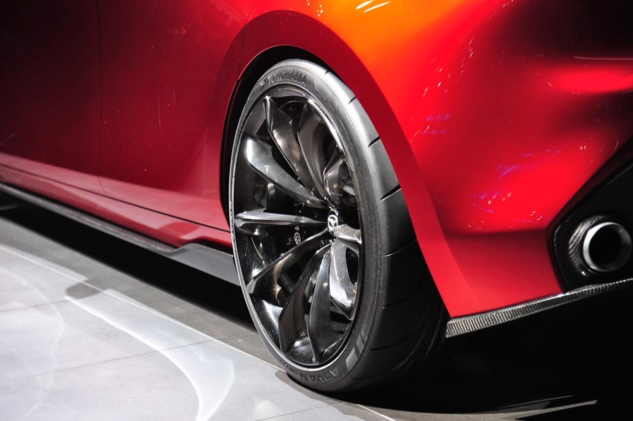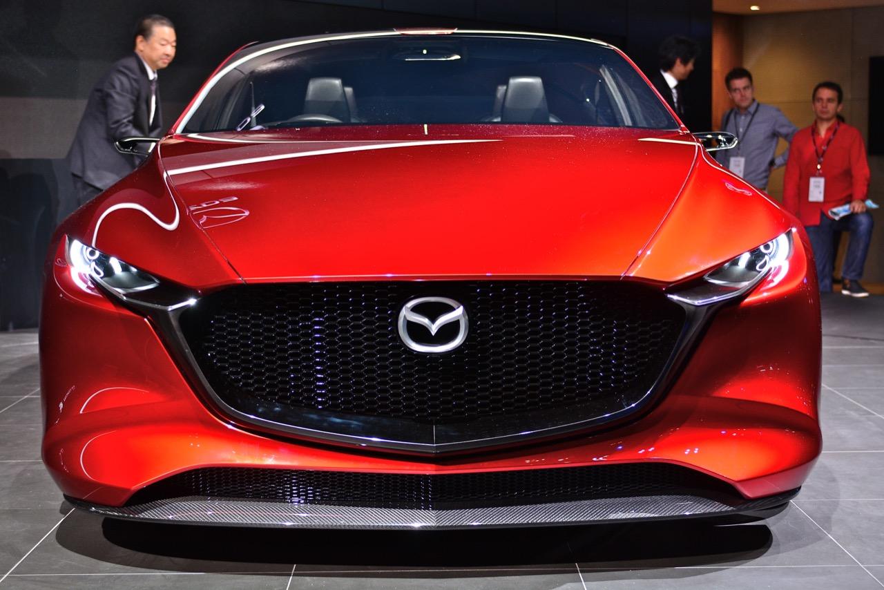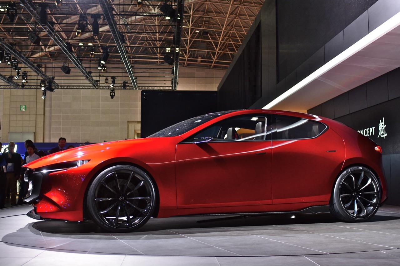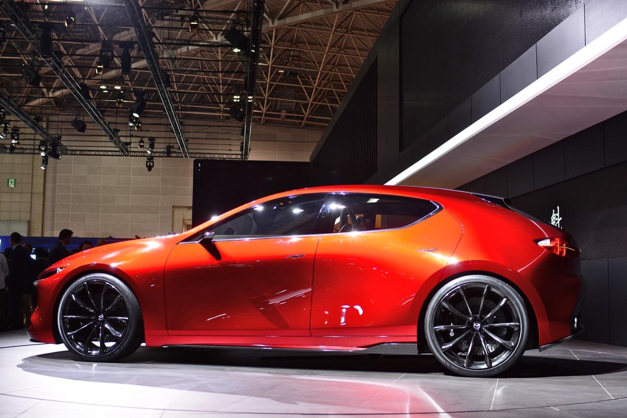 Mazda KAI Concept รถต้นแบบแนวคิดที่ถูก Mazda Motor นำมาจัดแสดงในงานโตเกียวมอเตอร์โชว์ครั้งที่ 45 ประจำปี 2017 จะกลายมาเป็น New Mazda 3 ซึ่งจะถูกเผยโฉมหน้าที่แท้จริงในช่วงปลายเดือนพฤศจิกายนนี้ KAI Concept คือตัวอย่างอันเด่นชัดของงานดีไซน์ใน New 3 โดยมีการปรับเปลี่ยนลงลึกในรายละเอียดของตัวรถคันผลิตจริงไม่มาก หลังคากระจก Panoramic Roof แบบผ่าครึ่งของรถต้นแบบถูกยกเลิกออกไป กลายเป็นซันรูฟแบบปกติ มือจับประตูทำงานด้วยระบบสัมผัสในรถคันต้นแบบจะกลายเป็นมือจับแบบธรรมดา แต่มีระบบ Keyless แค่แตะที่มือจับประตูก็จะปลดล็อก กระจกมองข้างแบบกล้องมองภาพจะเปลี่ยนเป็นกระจกมองข้างแบบธรรมดาพร้อมเลนส์ไฟเลี้ยว ล้ออัลลอยขอบใหญ่ยักษ์ขนาด 20 นิ้วในรถคันต้นแบบก็จะเปลี่ยนมาเป็นล้อขอบ 18 นิ้วที่มีลวดลายคล้ายล้อของ ส่วนไฟท้ายนั้นแทบจะไม่เปลี่ยนรูปทรง ยังคงเหมือนกับไฟท้าย LED ใน KAI Concept รูปทรงแฮตช์แบคที่ลงตัวของ New Mazda 3 2019 เป็นการประกาศศักดาในด้านงานดีไซน์รถยนต์ของแบรนด์ Mazda โดยเหนี่ยวนำเอาแนวความคิดใหม่มาปรับใช้ หนึ่งในแนวคิดที่นำพา Mazda ไปสู่ความสำเร็จก็คือ KODO Design ซึ่งเป็นคำที่แปลความหมายได้ว่า จิตวิญญาณของการเคลื่อนไหว